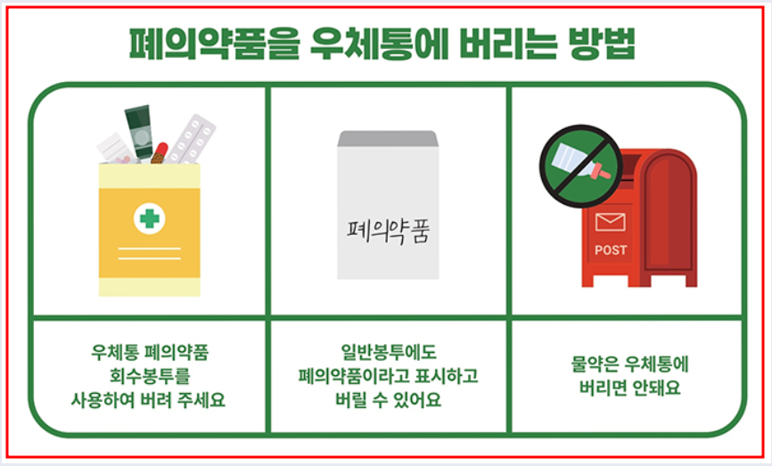 폐의약품 수거함은 가까운 주민센터와 보건소에 있으며, 2024년부터는 우체국이나 우체통에 폐의약품을 넣어도 됩니다. 요즘에는 아파트단지내에도 폐의약품 수거함이 많이 설치되어 있습니다.